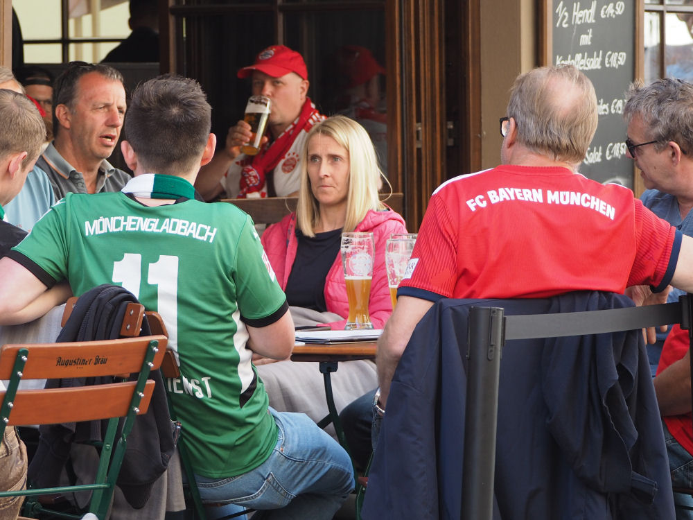 Borussia Mönchengladbachin ja Bayern Münchenin fanit istuivat sopuisasti ennen peliä kuppilassa. Joo, yritettiin saada liput loppuunmyytyyn otteluun, mutta halvin hinta oli 497 euroa per lippu, niin jätettiin menemättä.