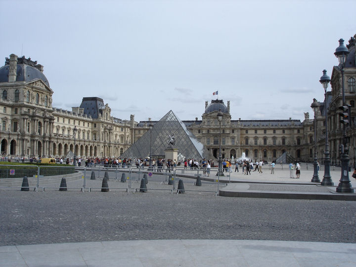Louvren museo. Keskellä museon pyramidimäinen sisäänkäynti.