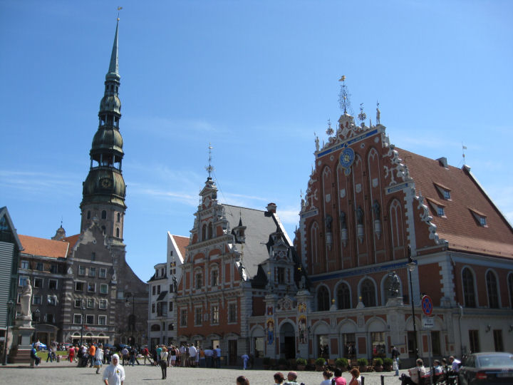 Pietarinkirkon, kuten monien muiden Riian vanhimpien kirkkojen torninnokassa ei ole ristiƤ vaan kukko. Kukko on kristillisen perinteen mukaan tehokas pahan karkottaja. Oikealla MustapƤiden talo.