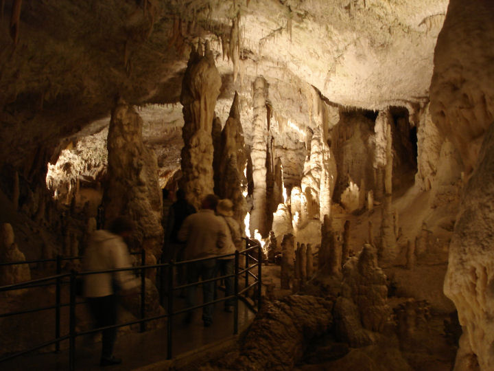 Postojnan kalkkikiviluolat. Valtavassa luolassa kuljettiin pienoisjunalla ja jalkaisin. Postojna, Slovenia.