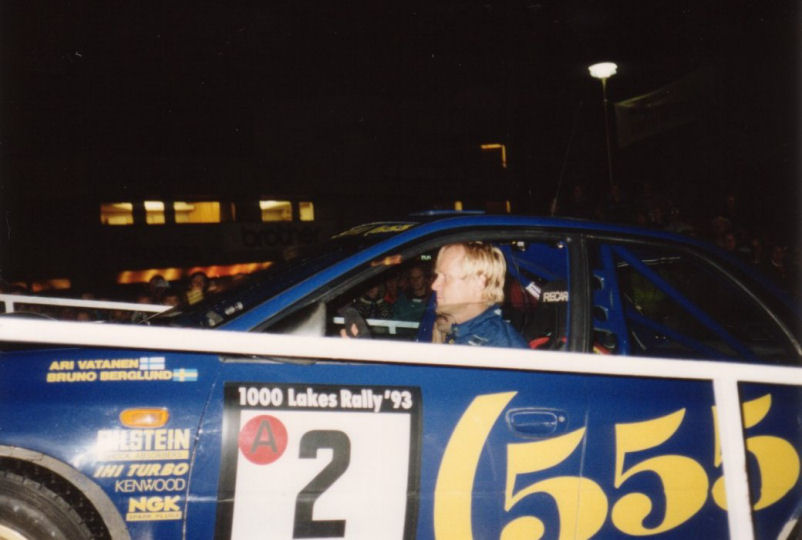 Ari Vatanen tulossa Suurajojen yötauolle Subaru Imprezalla hotelli Laajavuoren pihalla. JYVÄSKYLÄ 1993