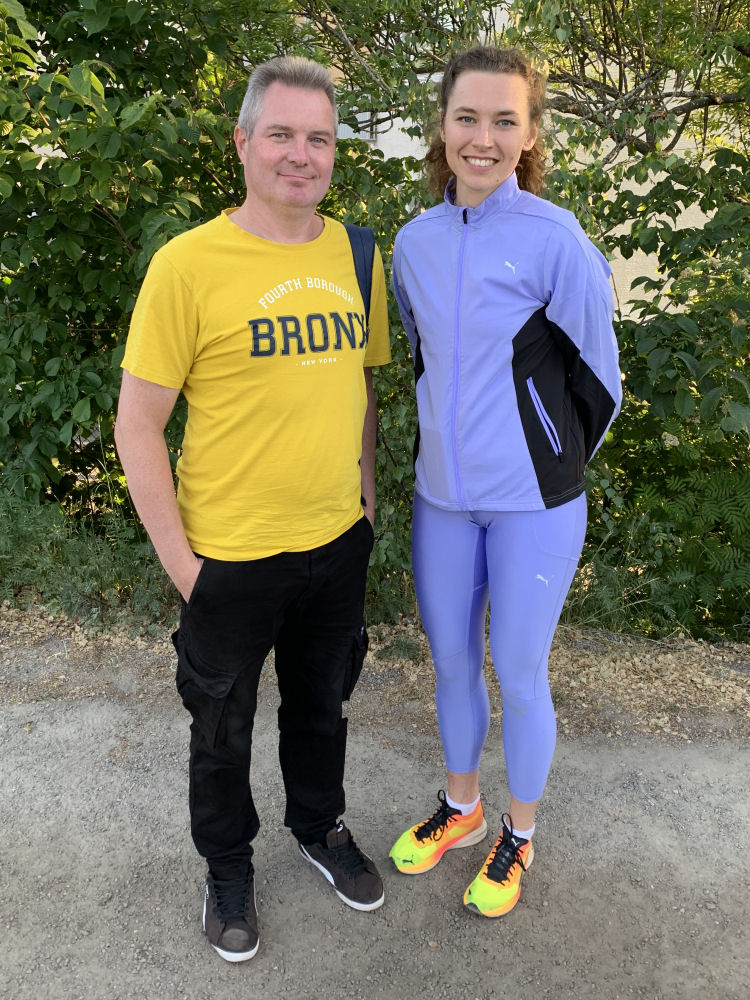 Paavo Nurmi Games. Korkeushypyn Suomen ennätyksen (195) omaava Ella Junnila. Yhteiskuvan jälkeen tituleeraan myöskin Ellaa röyhkeästi "mun hyväksi ystäväkseni". TURKU 2023
