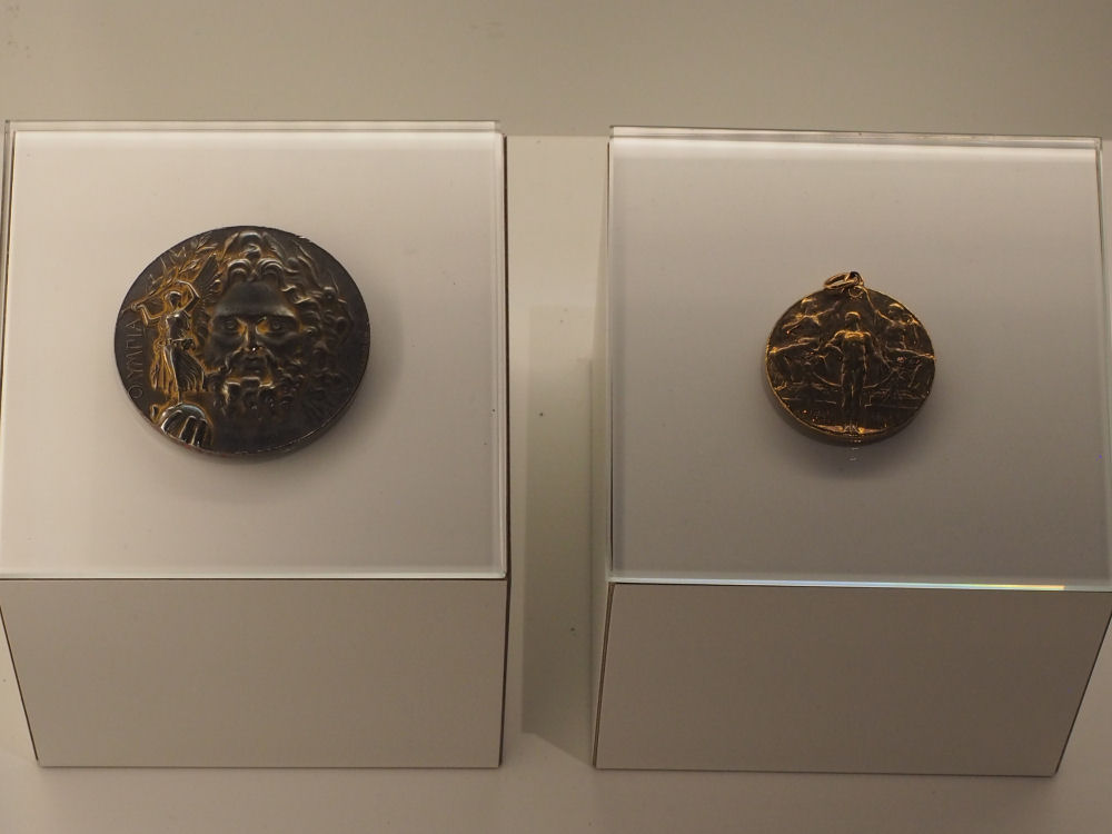 Museo Tahto - Suomen Urheilumuseo. Ensimmäisen suomalaisen olympiavoittajan, painija Verner Weckmanin kultamitalit. Ensimmäinen tuli Ateenan välikisoista 1906 ja toinen Lontoosta 1908. HELSINKI 2023