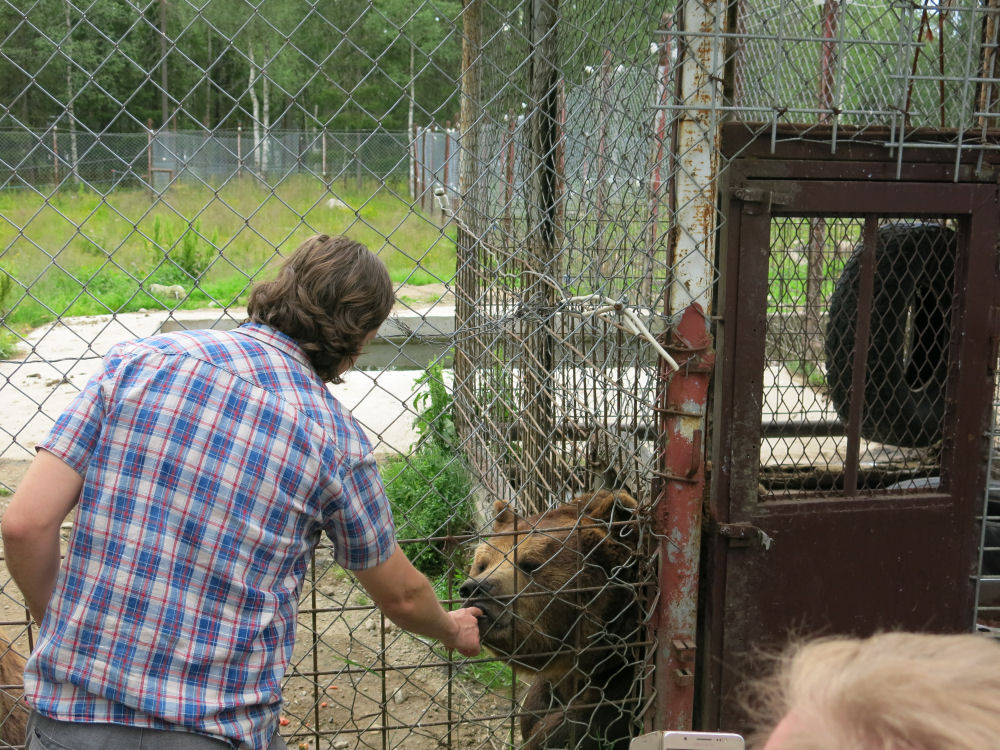 Juuso-karhu nuolee hunajaa hoitajan sormista Suurpetokeskuksessa.
