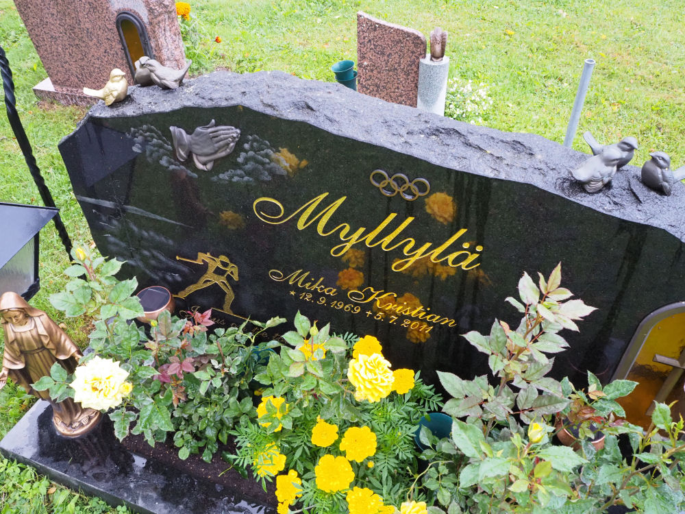 Mika Myllylän hauta. Olympiavoittaja ja maailmanmestari on haudattu Haapajärven uudelle hautausmaalle. Kuusi olympiamitalia, yhdeksän MM-mitalia. Yksi Suomen kovimpia hiihtäjiä. HAAPAJÄRVI
