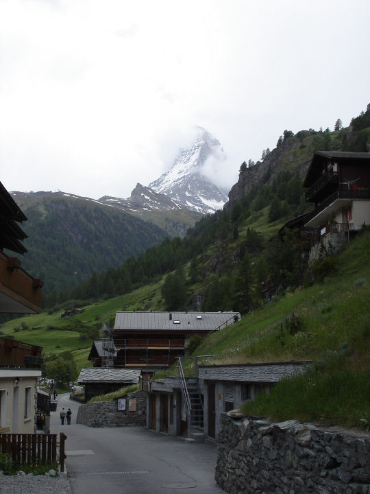 4478 metrinen Matterhorn. Pilvien peitossa, mutta viimeinkin "oikealta" puolelta nähtynä. Zermatt, Sveitsi.