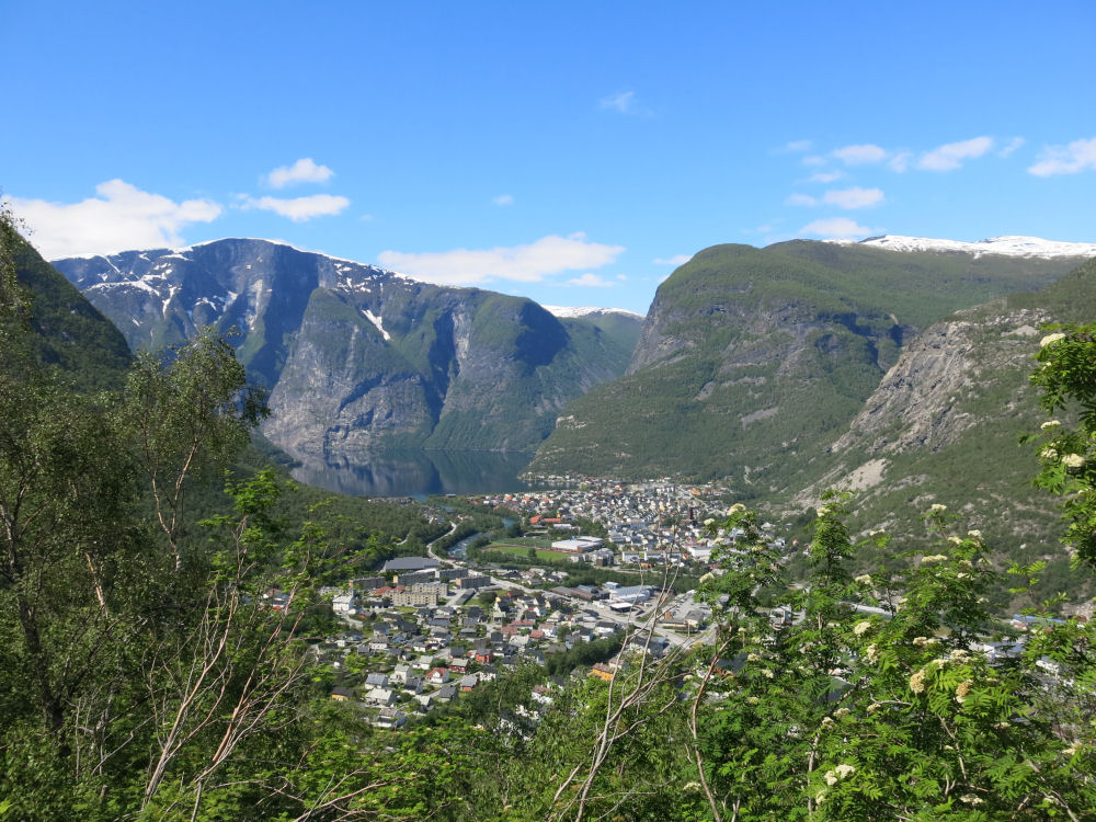 Øvre Årdalin kaupunki vuorten laaksossa ja järven rannalla.