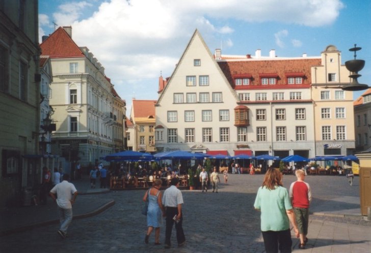 Raatihuoneen tori vanhankaupungin sydämessä. Sami painelee jo edellä menemään.
