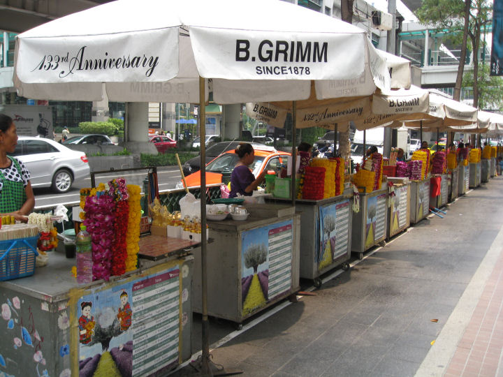 Kukkanauhamyyjiä lähellä Erawanin temppeliä.