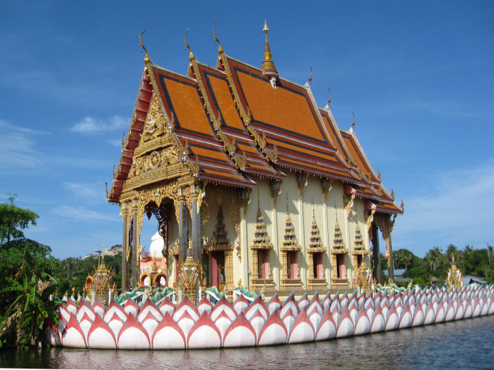 Temppeli ikään kuin kelluu suuren lootuslehden päällä.