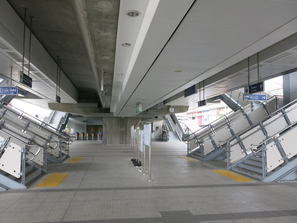 Pak Nam Station. Ilmajunaa (kuten metroakin) on jatkettu kilometritolkulla vähän joka suuntaan. Uudet asemat ovat vielä melko hiljaisia. BANGKOK / SAMUT PRAKAN