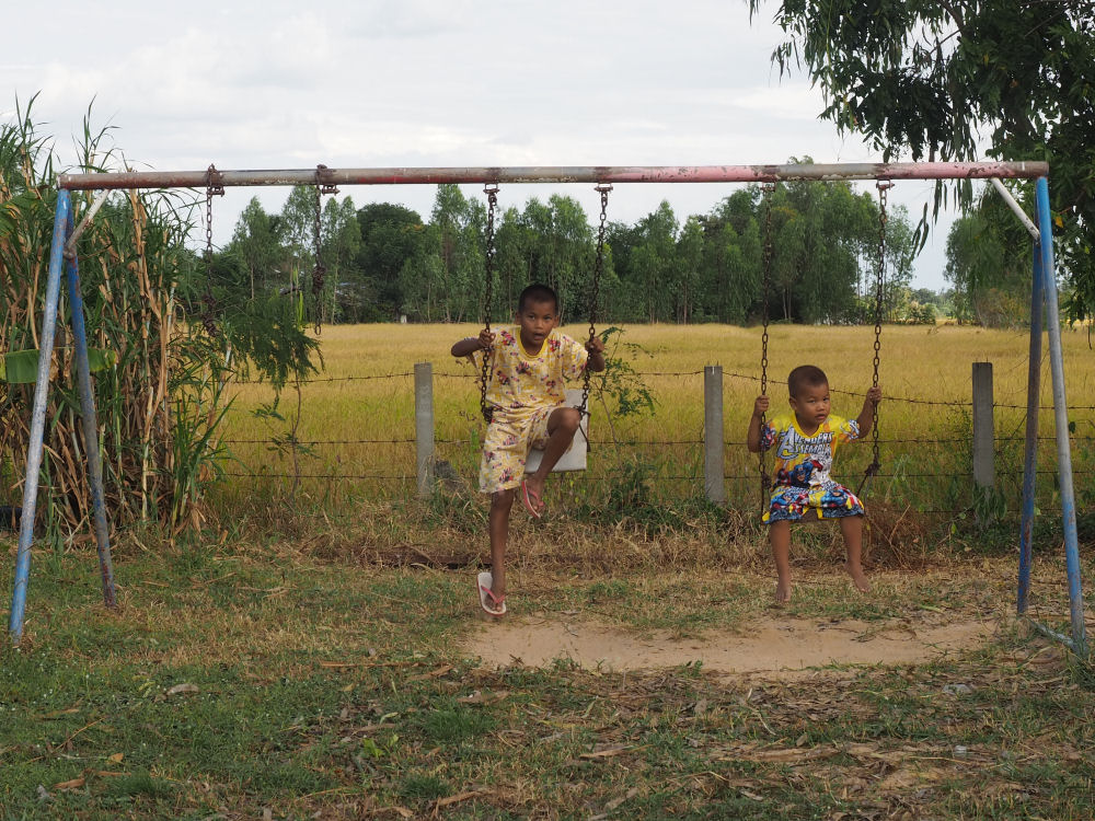 Velimiehet Ba ja Bia kyläkoulun keinulla.