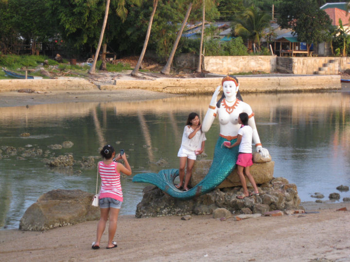 Tyttöjoukko ja merenneitopatsas. Big Buddha Beach.