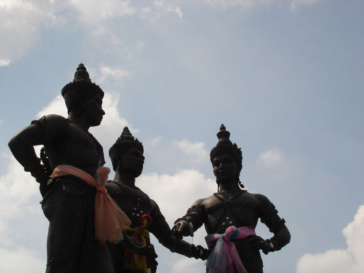 Kolmen kuninkaan monumentti. Kuningas Mengrai (Chiang Main kaupungin perustaja), hänen hyvä ystävänsä, Sukhothain kuningas Ramkamhaeng ja Payaon kuningas Ngam Muang.