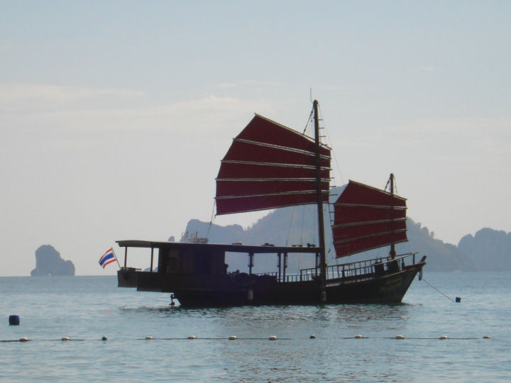 Jostain purjehti myƶs kiinalaistyylinen dzonkki maisemaan.