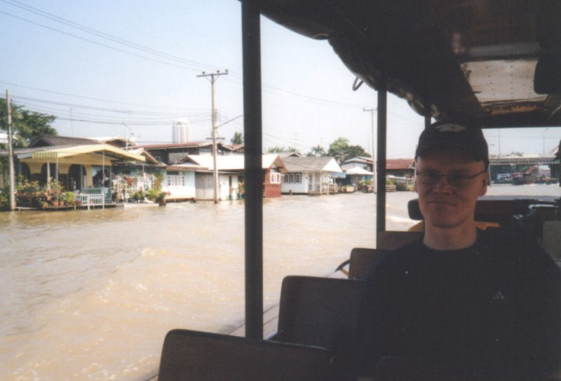 Sami jokiveneen kyydissä. Vesi on vielä todella korkealla sadekauden jäljiltä.