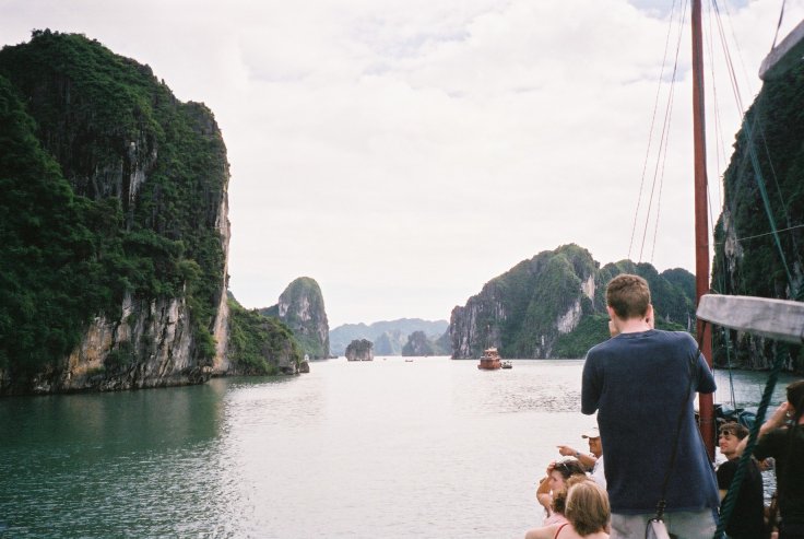 Toistakymmentä reissaajaa vietiin laivalla mantereelta Cat Ban saarelle yöpymään.