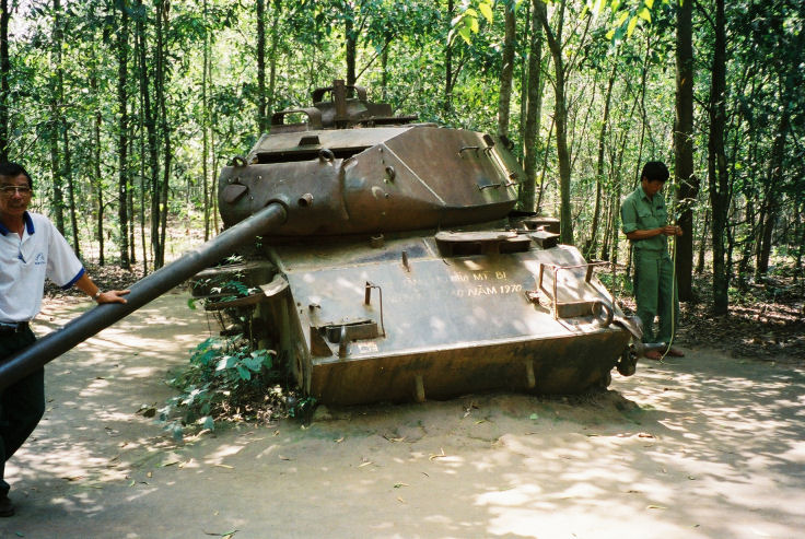 Cu Chi-tunnelit. Amerikkalaistankki, joka oppaan (vas. laidassa) tarinan mukaan oli ajanut omaan miinaan. Oikeassa laidassa puistonvartija, joka näyttävästi juuri hetkeä aiemmin pyydysti käsissään pitämänsä käärmeen viidakosta. CU CHI, VIETNAM
