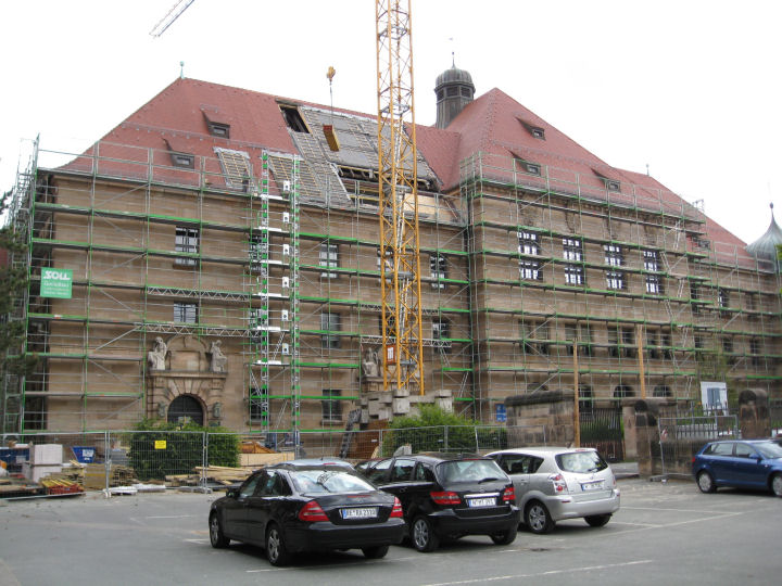 Nürnbergin Oikeuspalatsi oli kiinni korjaustöiden vuoksi. Muuten olisimme päässeet käymään palatsin kuuluisassa salissa nro. 600, jossa toisen maailmansodan jälkeen monet natsijohtajat tuomittiin. NÜRNBERG, SAKSA