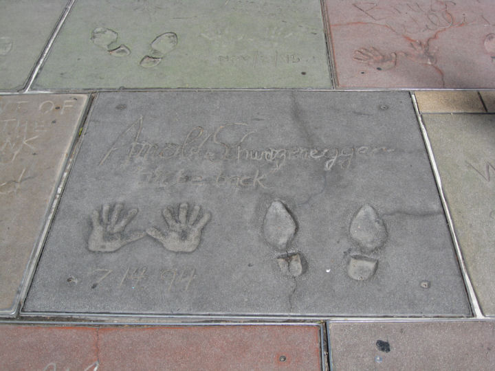 Hollywood Boulevard. Grauman’s Chinese Theatre - Arnold Schwarzeneggerin käden- ja jalanjäljet betonissa. LOS ANGELES