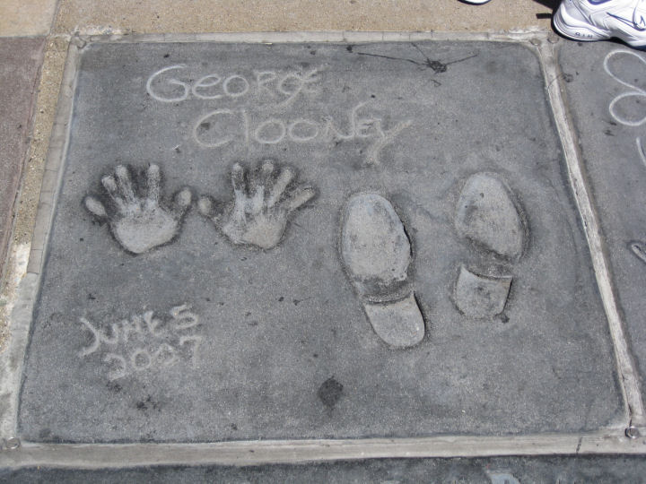 Hollywood Boulevard. Grauman’s Chinese Theatre - George Clooneyn käden- ja jalanjäljet betonissa. LOS ANGELES