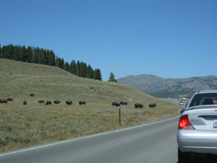 Kymmeniä biisoneja ylittämässä tietä.