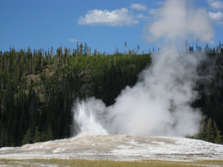 Yellowstonen kansallispuisto. Tässä lämmittelee maailmankuulu geysir, Old Faithful eli Vanha Uskollinen, joka purkautuu 65–92 minuutin välein noin viiden minuutin ajan. YELLOWSTONE