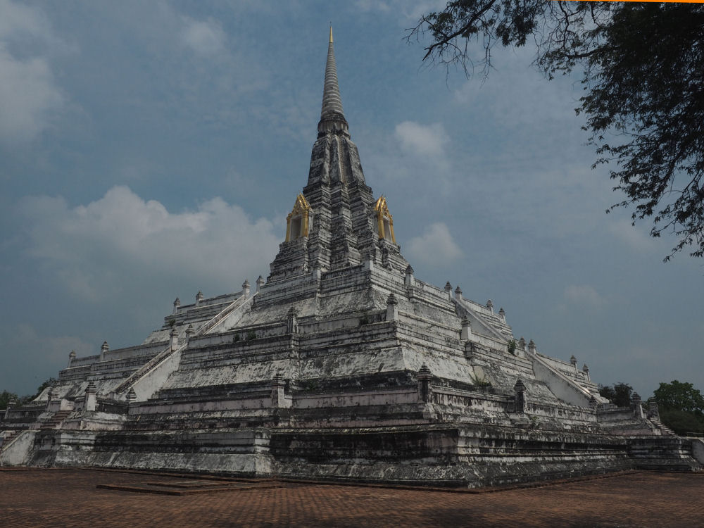 Wat Phu Khao Thong. Erikoinen ulkonäkö johtuu siitä, että temppeli jäi burmalaisilta valloittajilta leveän alaosan jälkeen kesken ja thaimaalaiset rakensivat keskustan huomattavasti kapeamman chedin kaupungin uudelleenvaltauksen jälkeen. AYUTTHAYA