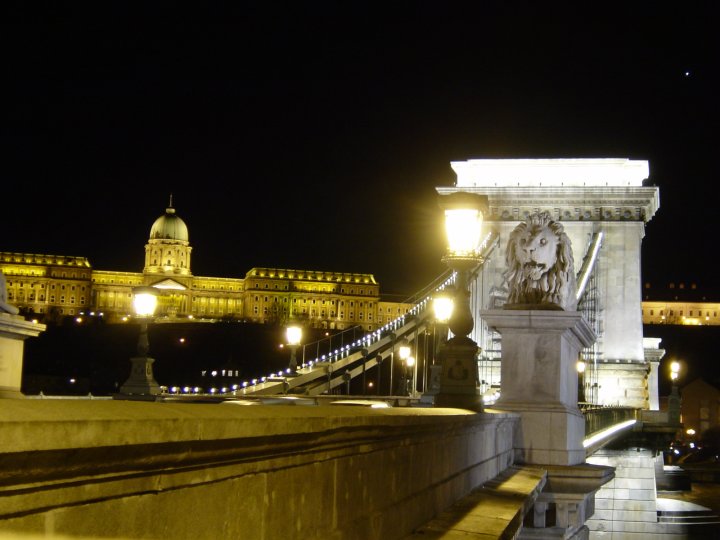 Ketjusilta öisessä valossa. Taustalla Budan linna.