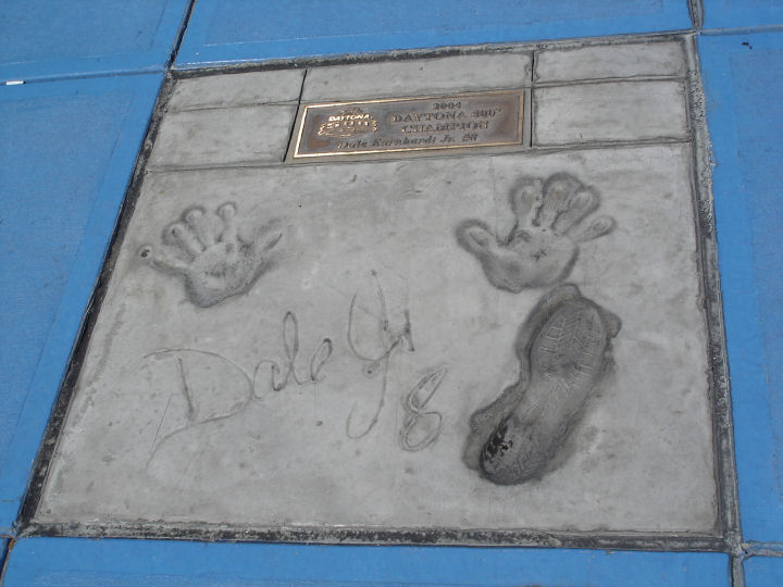 Daytona speedway. Vuoden 2004 voittaja, Dale Earnhardt Jr, on painanut katensä ja kaasujalkansa betoniin.
