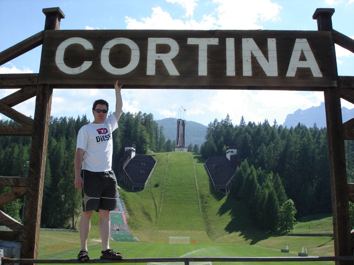 Vuoden 1956 olympialaisten hyppyrimäki. Tuttu myös elokuvasta James Bond, Erittäin salainen. Cortina d'Ampezzo, Italia.