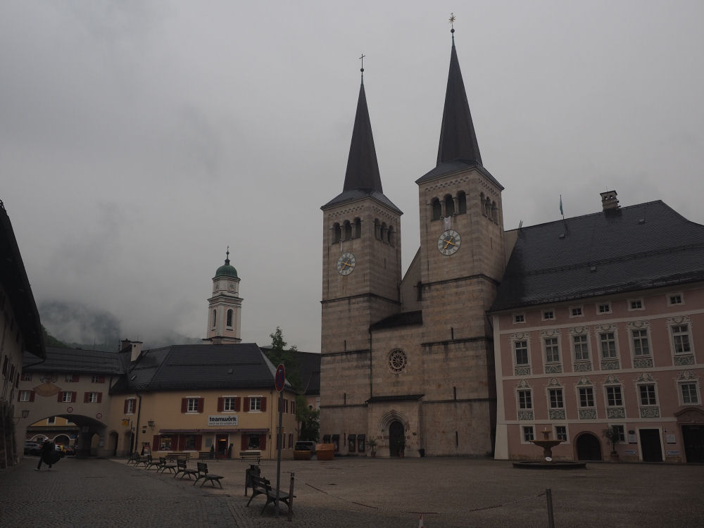 Berchtesgadenin Linnanaukiota hallitsee Stiftskirche. Pienempi St. Andreas taempana.