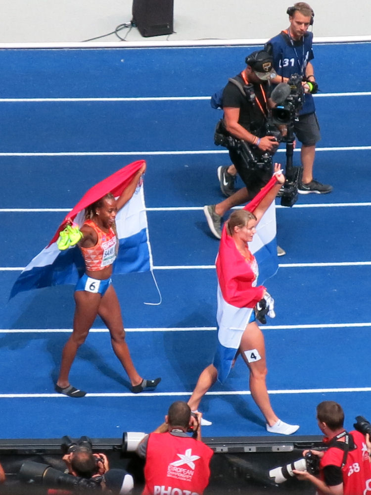 Naisten 200 metrin hollantilaiset mitalistit: Jamile Samuel (pronssia) ja Dafne Schippers (hopeaa). BERLIINI