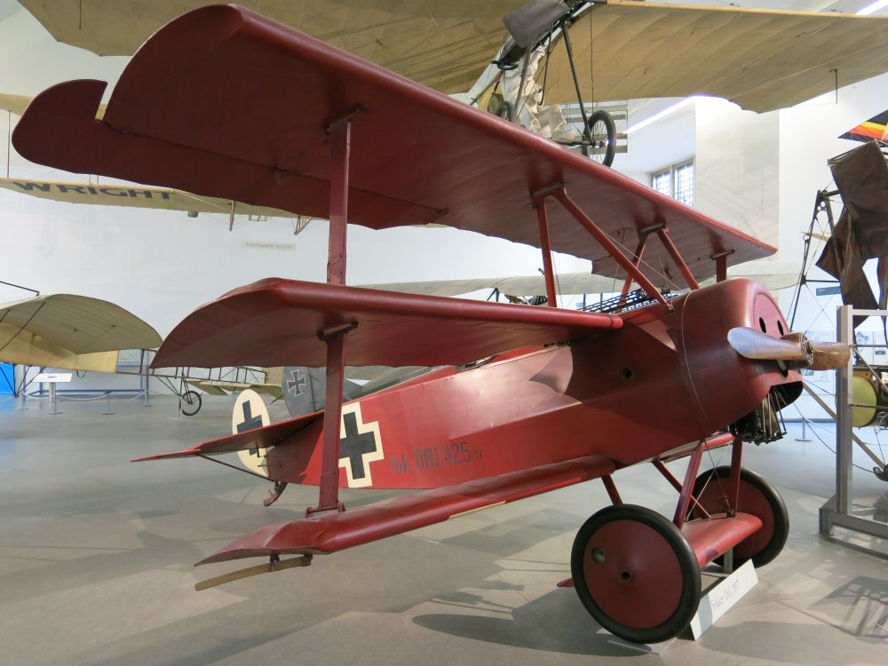 Deutsches Museum. Kopio Punaisen paronin ensimmäisen maailmansodan kolmitasoisesta hävittäjästä Fokker Dr.I:stä. MUNCHEN