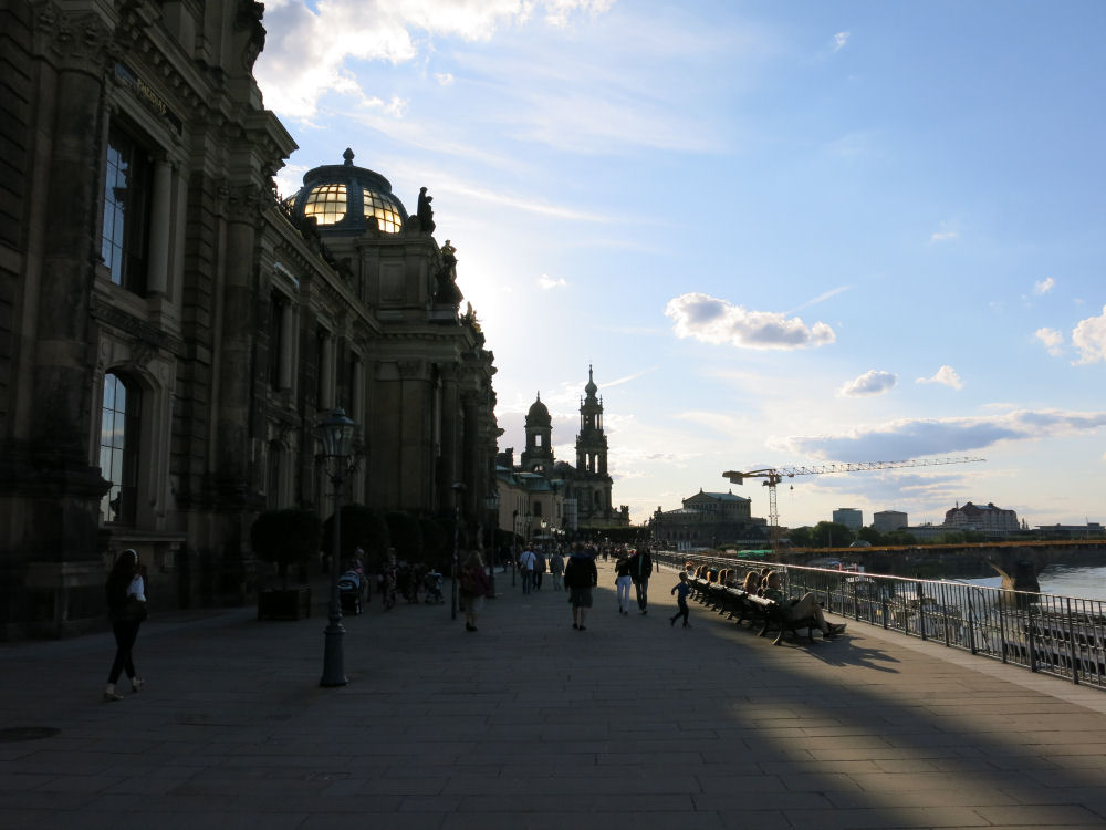 Bruhlsche Terrasse. Bulevardi Elben rannan ja vanhankaupungin välissä. Moni rakennus näyttää vanhalta, mutta ei ole. Kaikki on rakennettu uudelleen toisen maailmansodan jälkeen. DRESDEN