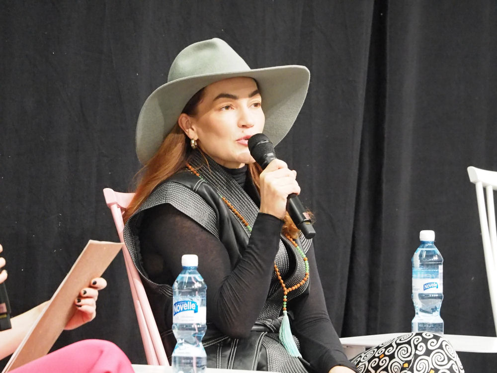 Valokuvaaja Meeri Koutaniemi puhumassa Matkamessuilla.