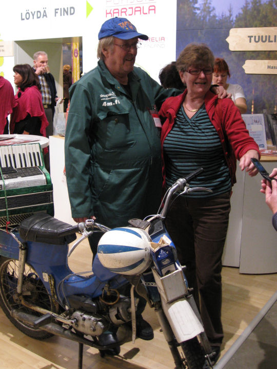 Näyttelijä Risto Salmi huoltamonpitäjä Turpeisen roolissa Matkamessuilla 2011.