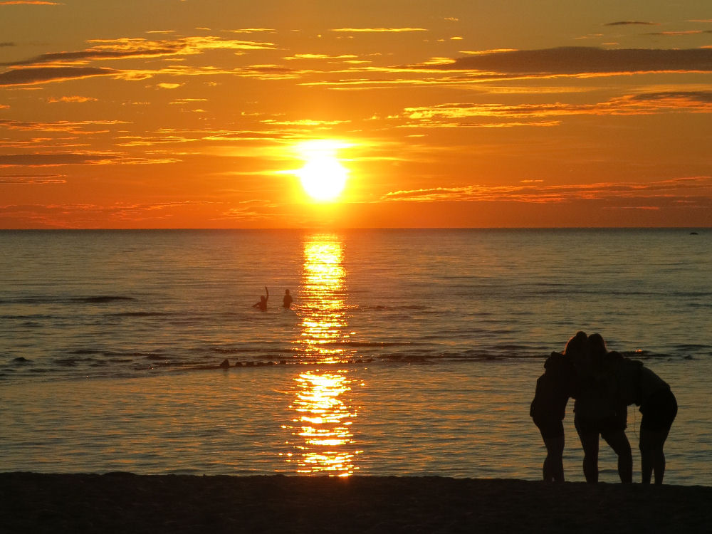 Tytöt hakee jotain joukkovoimaa hienossa auringonlaskussa.