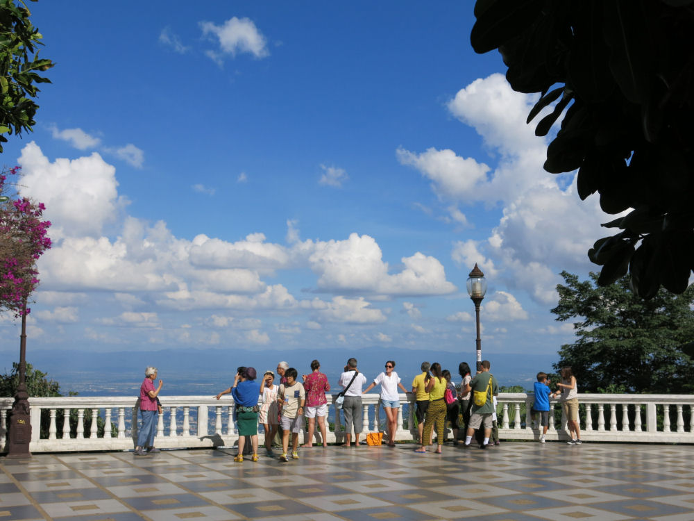 Wat Phrathat Doi Suthep. Näköalatasanteelta harvoin näkee sumun ja pilvien vuoksi 15:n kilometrin päässä olevaa Chiang Main kaupunkia. CHIANG MAI