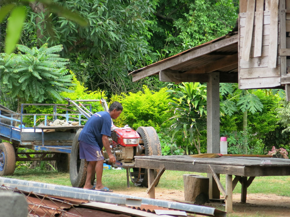 Mayn tädin mies huoltaa peltokalustoa päivän päätteeksi.