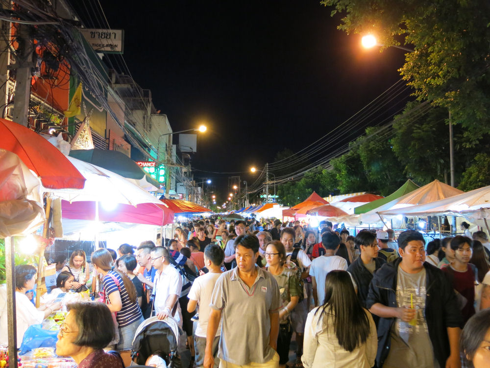 Joka sunnuntaiset yömarkkinat Rachadamnoenilla vetää väkeä.