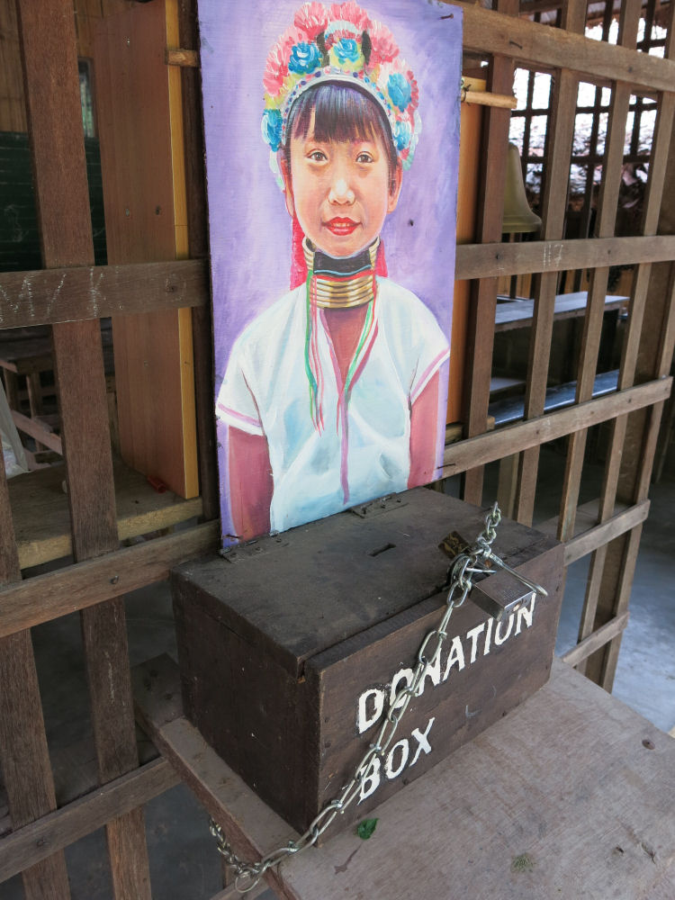 Tong Luangin vuoristoheimokylä. Koulun lahjoituslaatikko on köytetty ketjulla, ettei kyläläiset vain pääsisi rahoihin käsiksi, vaan että joka penni menee Thaimaan hallitukselle. CHIANG MAI