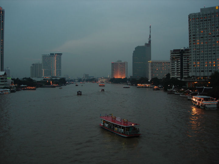 Ilta pimenee Bangkokin ja Chao Phraya-joen yllä.