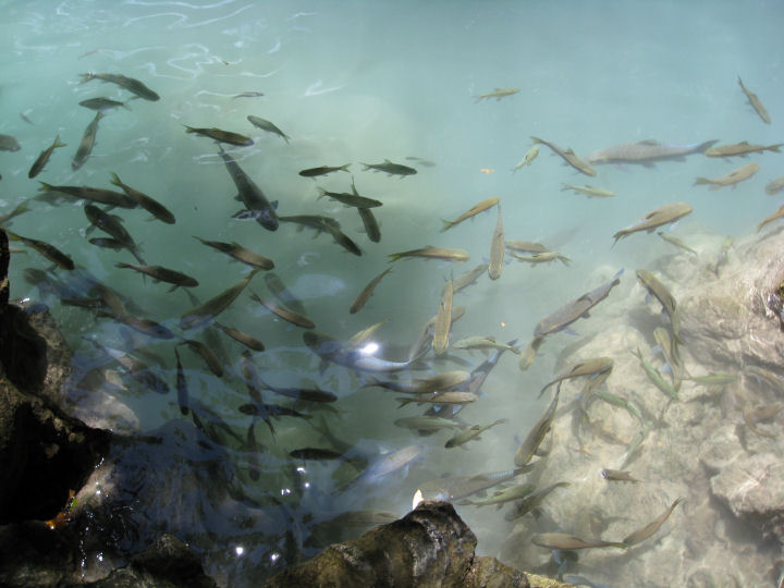 Kaloja oli putouksen jokaisessa "altaassa". Osa kävi jopa reippaasti kiinni uimarin jalkoihin.