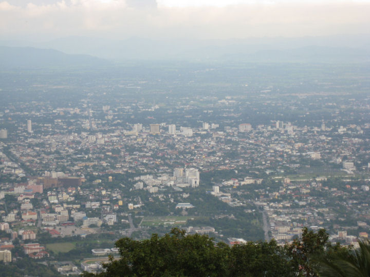 Doi Suthepin vuorelta Chiang Main kaupunkia ei tavallisesti näe ollenkaan sumun ja pilvien vuoksi, mutta nyt sattui lähes selkeä ilma.